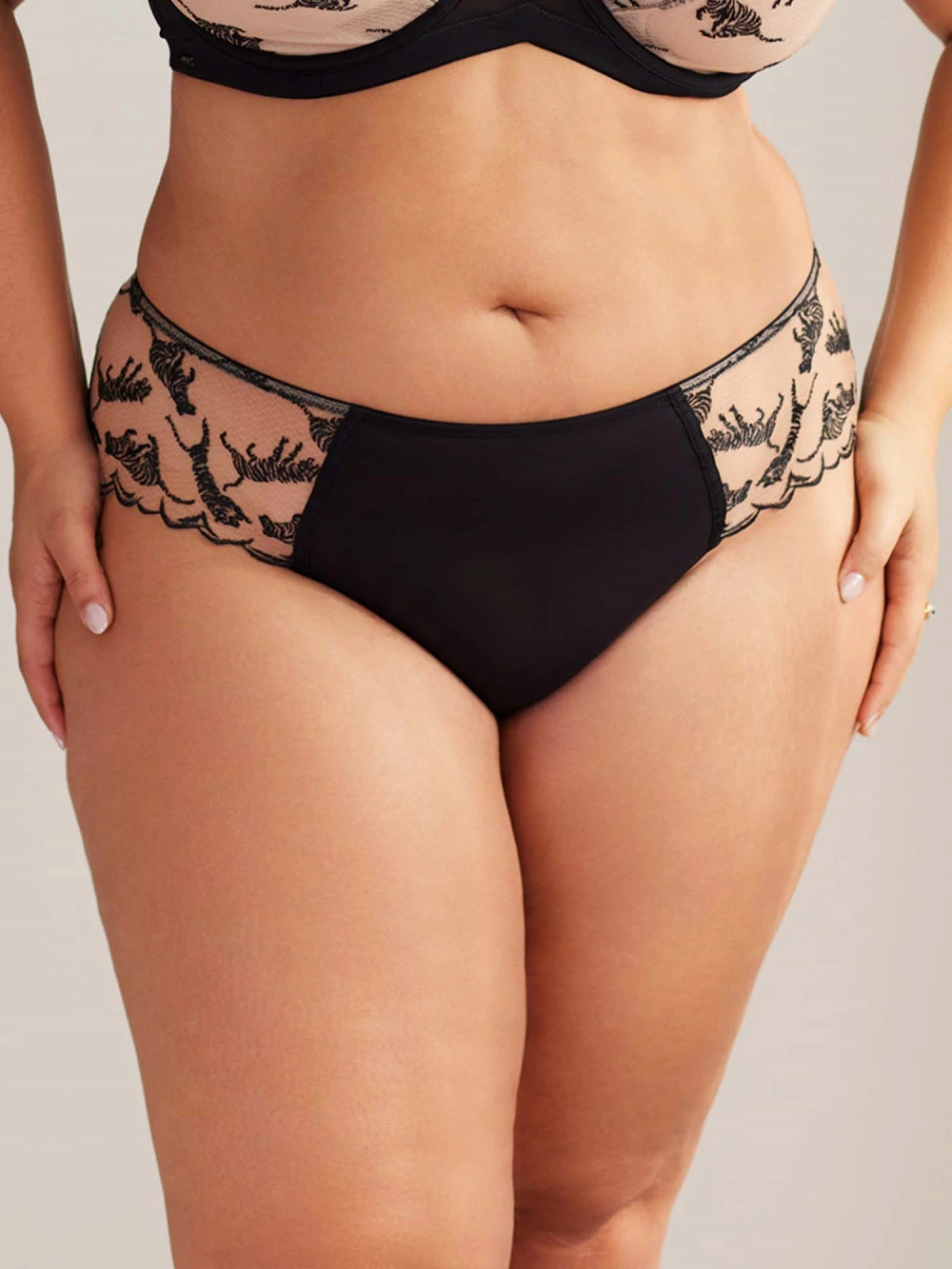 Shorty effet tatoo sur les côtés avec l’utilisation d’un tulle couleur peau brodé d’un motif tigre noir
